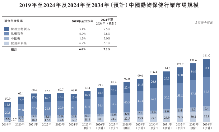 据招股书,成立于1999年,该公司是中国领先的动物保健企业。该公司主要从事全系列动物保健及配套产品的研发、生产及销售,产品涵盖兽用生物制品(如疫苗、抗体、转移因子等)、中兽药、化药制剂、动物饲料及饲料添加剂,实现对家禽、家畜、水产动物及宠物疾病的预防、诊断、治疗与控制。根据灼识咨询的资料,以2024年收入计,该公司是在中国动物保健市场中排名第九的国产厂商,并在中国禽用兽用生物制品市场排名前三。