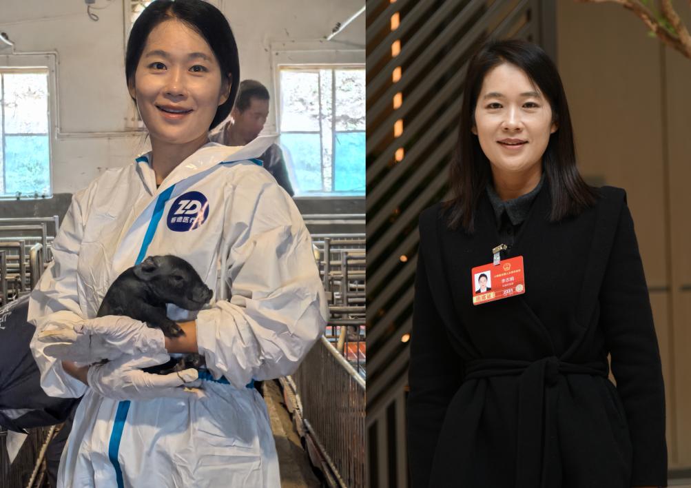 李志娟在养殖场(左,受访者供图);全国人大代表李志娟在云南代表团驻地(右,新华社记者王贤思摄)。