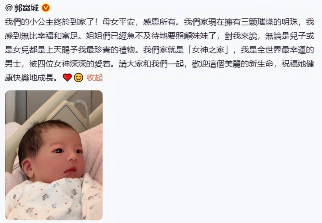 当晚郭富城就发动态了,说三个女儿是他生命中最亮的明珠,两个姐姐抢着抱妹妹,还强调男孩女孩都是宝贝,老婆加三个女儿就是他的四个女神,被她们围着特别幸福,演唱会上还当众喊我们家就是女神之家,方媛也说了句性别从来不是爱的条件,追生儿子的传闻就这么被否了,