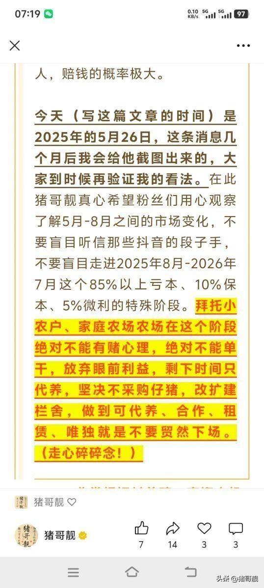 2026年全年猪价我们预判是七元上下波动,其中上半年五月以前预计会在六元上下波动,特别是三四五月份,尤为凶险,恐怕会跌破五元。