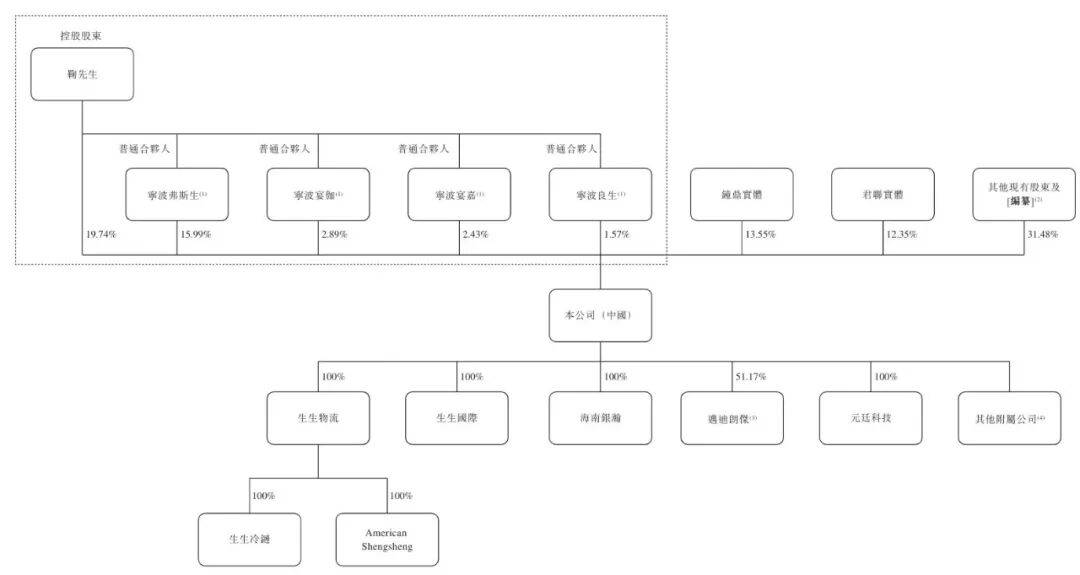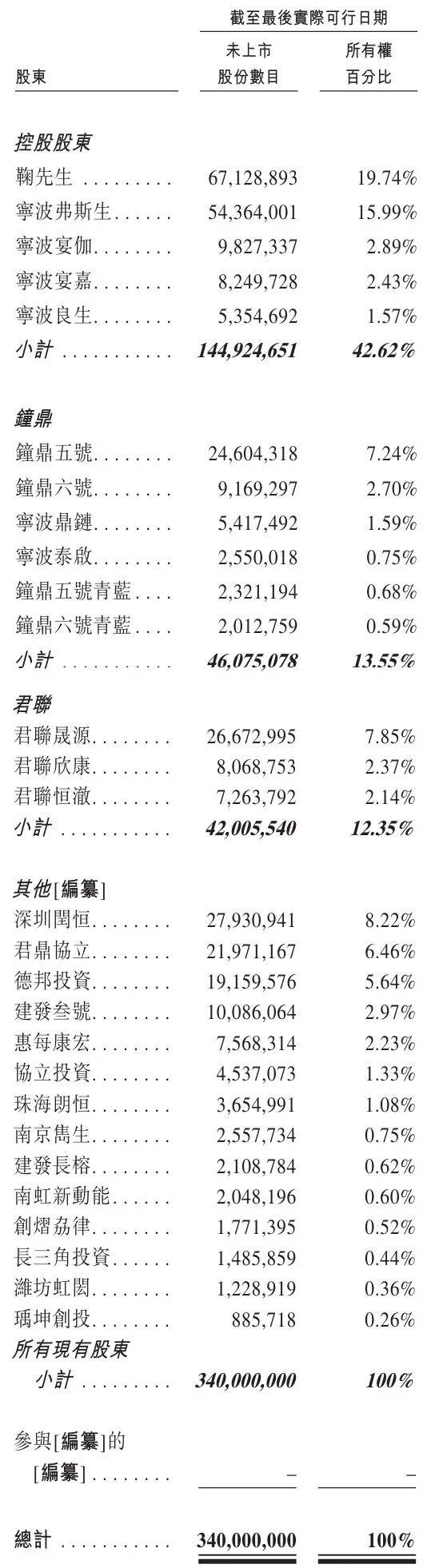 IPO前,鞠继兵持股19.7438%,宁波弗斯生持股为15.99%,宁波宴伽持股为2.89%,宁波宴嘉持股为2.43%,宁波良生持股为2.43%,控股股东一共控制42.62%股权。